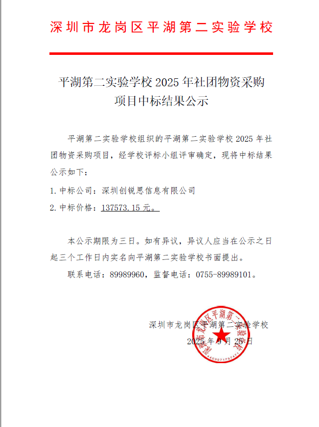 平湖第二实验学校 2025 年社团物资采购项目中标结果公示
