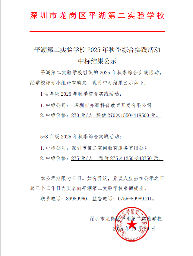 平湖第二实验学校 2025年秋季综合实践活动中标结果公示