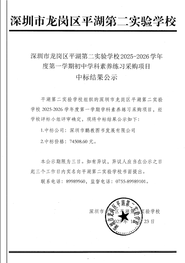 深圳市龙岗区平湖第二实验学校2025-2026学年度第一学期初中学科素养练习采购项目中标结果公示