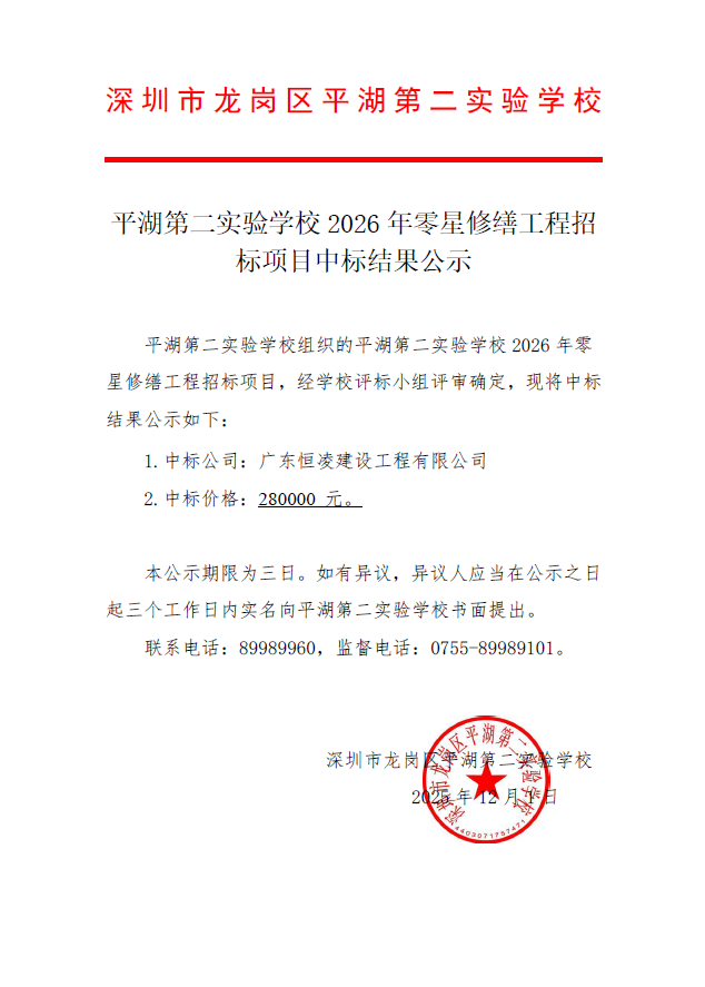 平湖第二实验学校 2026 年零星修缮工程招标项目中标结果公示