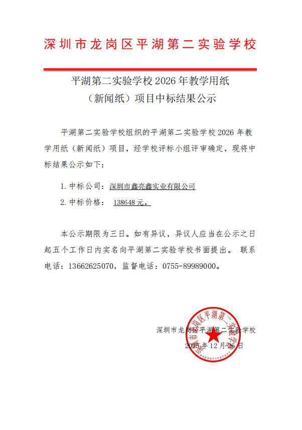 平湖第二实验学校 2026 年教学用纸(新闻纸)项目中标结果公示