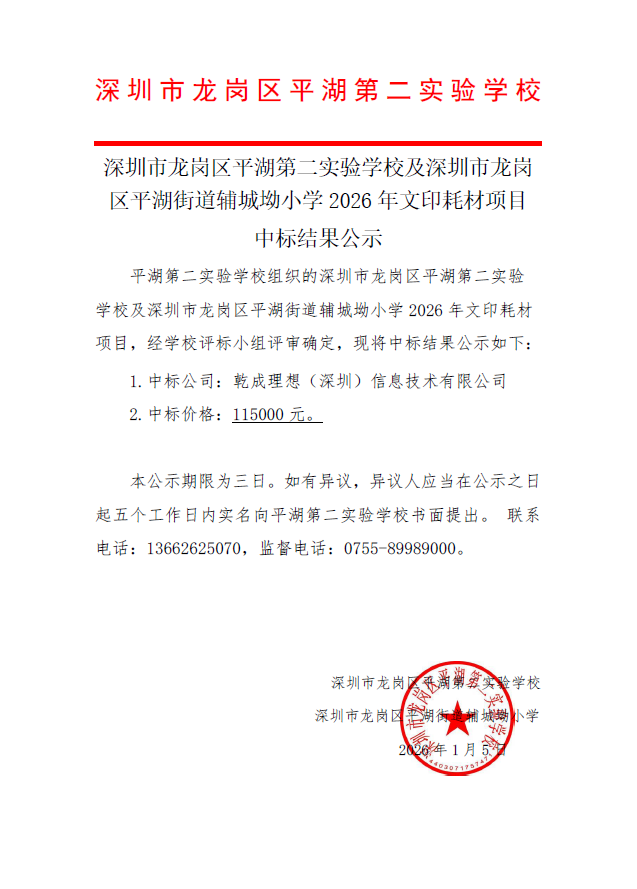 平湖第二实验学校2026年文印耗材项目中标结果公示
