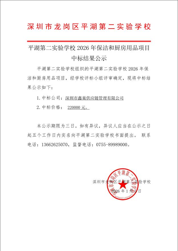 平湖第二实验学校2026年保洁和厨房用品项目中标结果公示