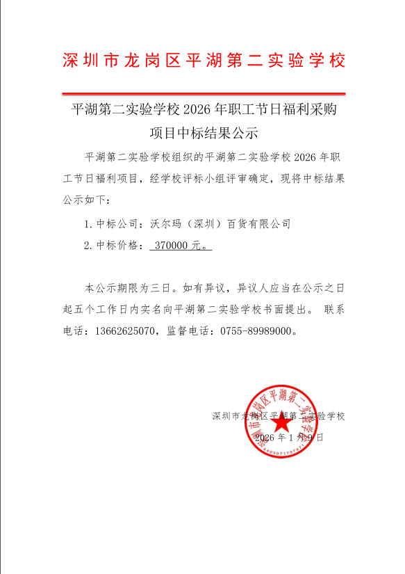 平湖第二实验学校2026年职工节日福利采购项目中标结果公示
