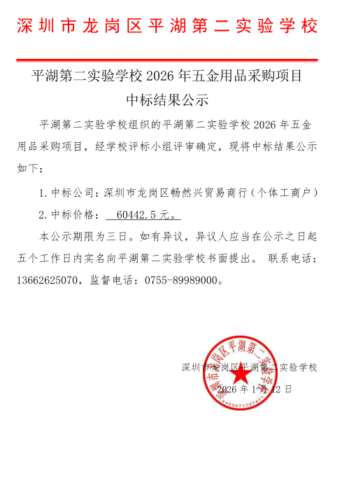 平湖第二实验学校2026年五金用品采购项目中标公示