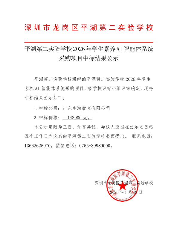龙岗区平湖第二实验学校学生素养AI智能体系统项目中标结果公示