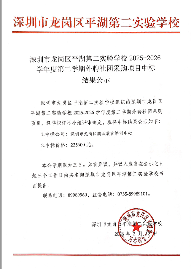 深圳市龙岗区平湖第二实验学校2025-2026学年度第二学期外聘社团采购项目中标 结果公示